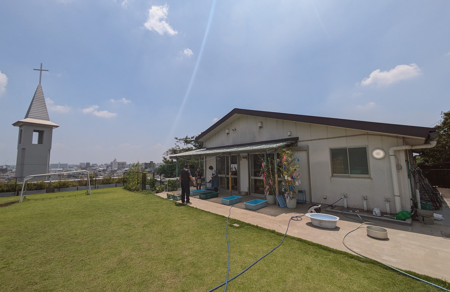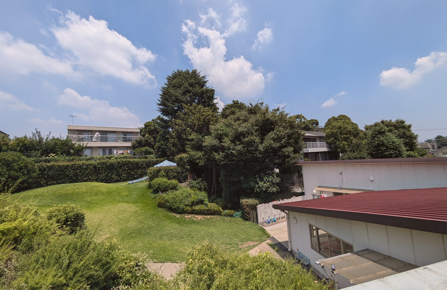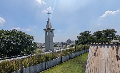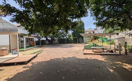 教えてください。 - 広さ2,000坪、高低差20m、花とみどりに囲まれた広々と起伏に富んだ敷地に、礼拝堂を中心として園舎、園庭、遊具、事務所などが点在しています。見上げると広い空がある広大な芝生の庭では、毎日子供たちが自由に駆け回り、四季折々の草花や小鳥、昆虫など自然に触れる機会もたくさんあります。この素晴らしい環境の中で、子どもたちは3年間心と体を育みます。
